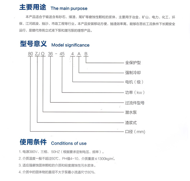 1、 ZJQ型潛水渣漿泵是電機(jī)與水泵同軸一體潛入介質(zhì)中工作的水利機(jī)械,該產(chǎn)品選材精良、結(jié)構(gòu)先進(jìn)、過流通道寬闊、排污能力強(qiáng)。適合于輸送含有沙石、煤渣、尾礦等固體顆粒的液體,主要用于冶金、礦山、火力發(fā)電廠等企業(yè)泥漿類液體的清除及輸送,是傳統(tǒng)泥漿泵的理想替代產(chǎn)品。