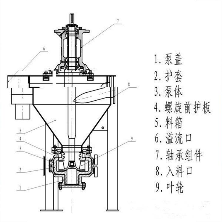 2.料箱采用鋼結(jié)構(gòu)或不銹鋼,鋼襯橡膠等,設(shè)有切向進料口和溢流箱,溢流箱可以方便地把多余的來料再送回料池,切向進口可使物料迅速地進入泵內(nèi)并消除部分泡沫。